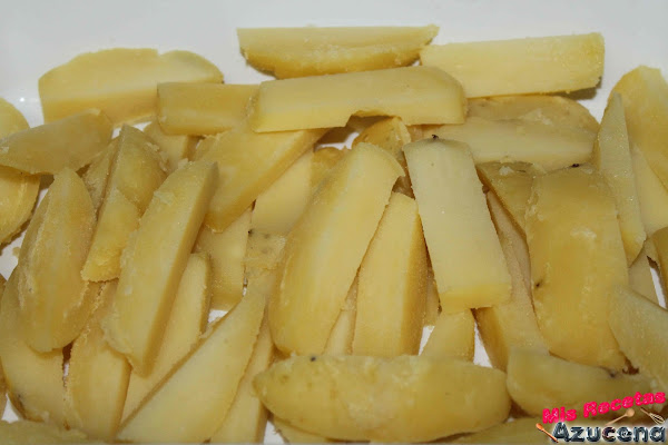 Ahora pondremos a precalentar el horno a una temperatura de 180º con ventilador, mientras se calienta cogeremos las patatas y les quitaremos la piel para cortarla en bastones gruesos.