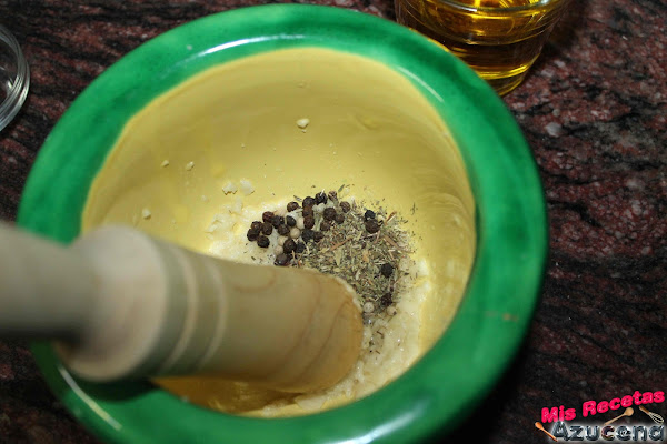 Ahora añadiremos las dos pimientas y las hiervas, seguimos machacando las pimientas y cuando las tengamos listas añadiremos el resto de los ingredientes, removemos todo y ya lo tenemos listo.