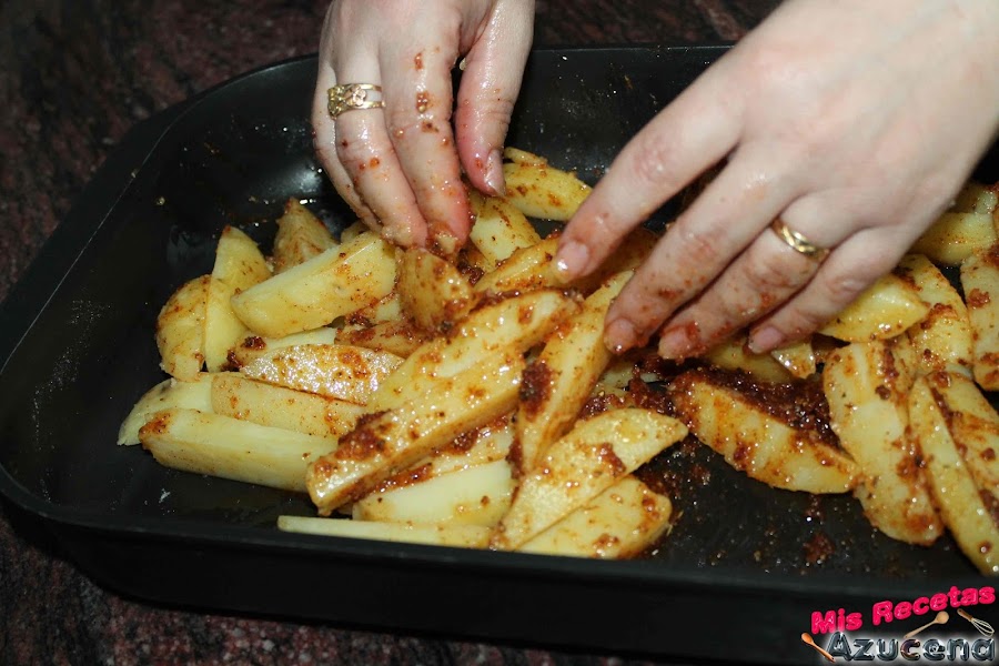 Necesitaremos una bandeja de horno lo suficiente grande como para que no queden unas encimas de otras, ponemos las patatas en la bandeja, añadimos el majado y con ayuda de nuestras manos mezclaremos bien para que todas las patatas queden bien impregnadas con el majado.