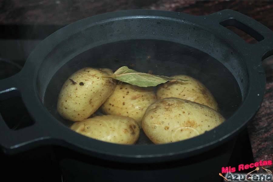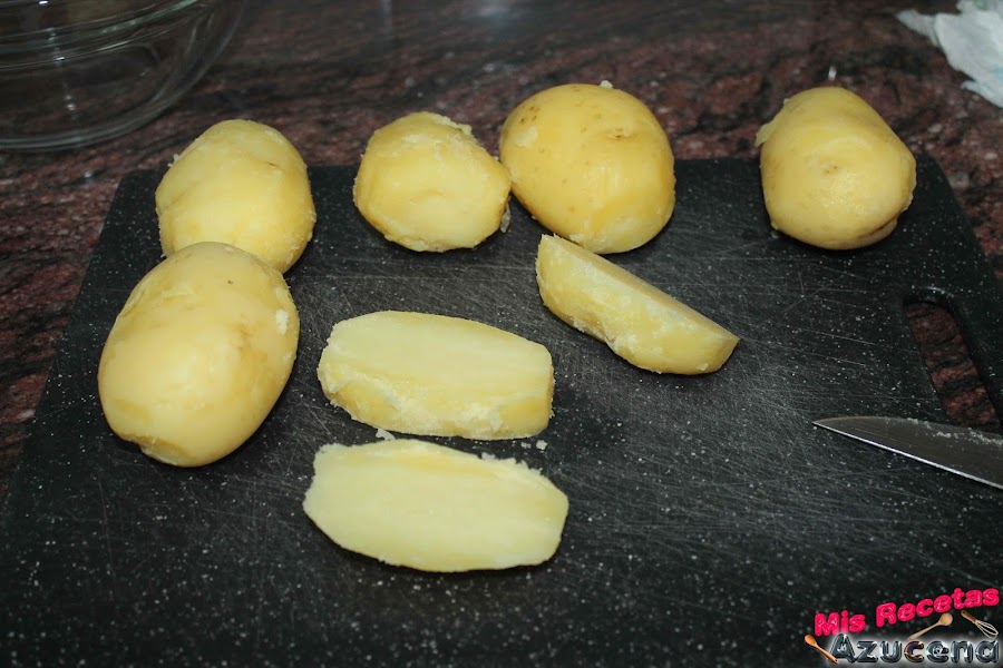 Las patatas que yo utilice las tuve que dejar 35 minutos, este tiempo puede variar dependiendo del tipo de patata, no queremos que se nos cuezan enteras, cuando pinchemos en la patata y veamos que están casi cocidas las retiramos del fuego, las queremos algo durillas, las dejaremos enfriar.