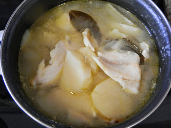 Añadimos agua, la cebolla, la patata, el ajo, el laurel y la merluza y dejamos cocer por una media hora aproximadamente (o hasta que la patata esté cocida).