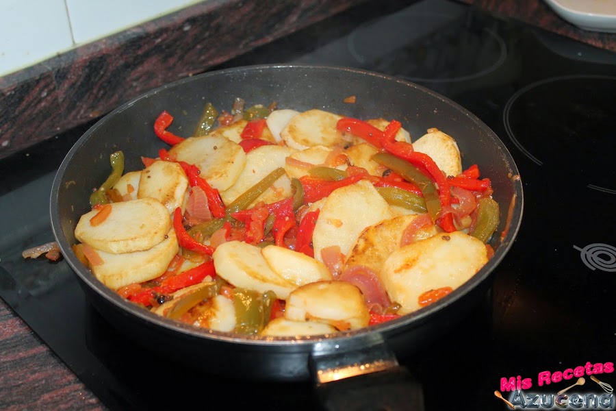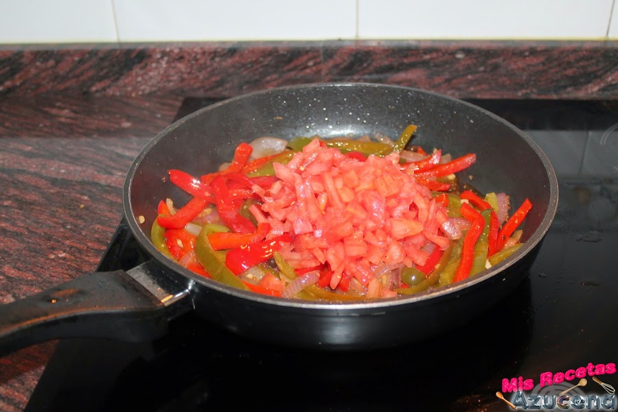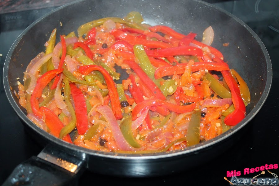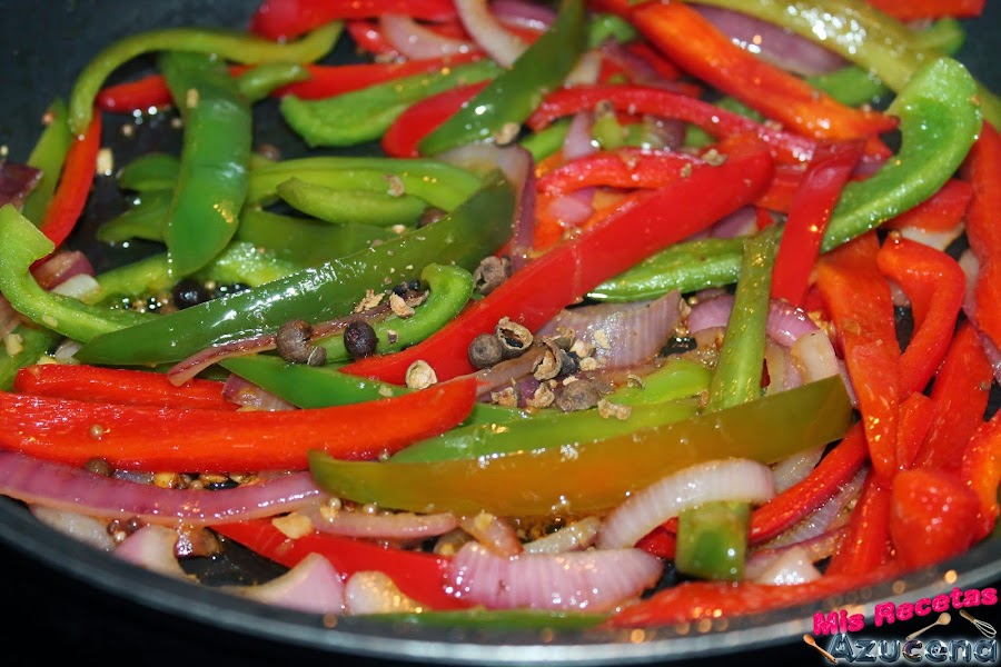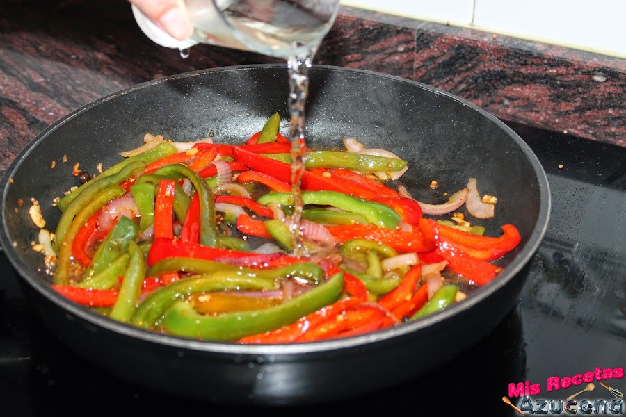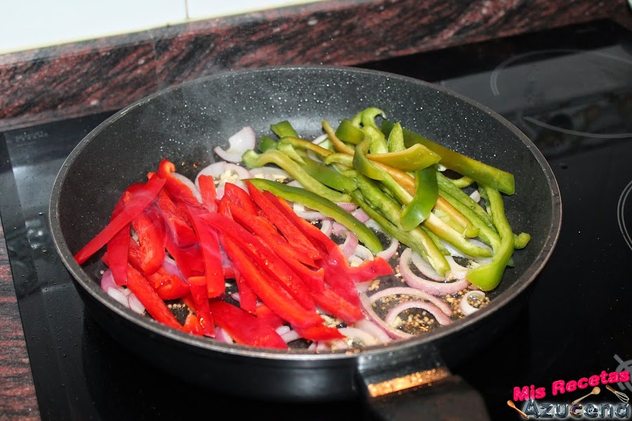 Pasados los dos minutos añadiremos los dos tipos de pimientos, removemos todo y lo volvemos a dejar unos 7 minutos más para que el pimiento se sofría un poco.