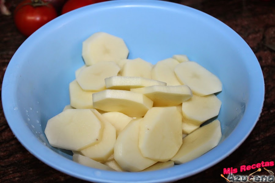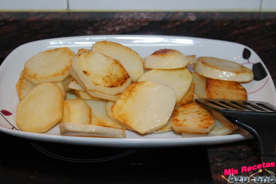 Lo primero que haremos será pelar las patatas y cortarlas en rodajas de medio centímetro de grosor, una vez las tengamos listas las lavaremos y le pondremos un poco de sal, ponemos una sartén al fuego a fuego medio alto y ponemos un chorreón de aceite, pondremos las patatas y las doraremos por los dos lados, serán unos dos o tres minutos por cada lado, una vez las tengamos doradas las retiraremos del fuego y reservamos.