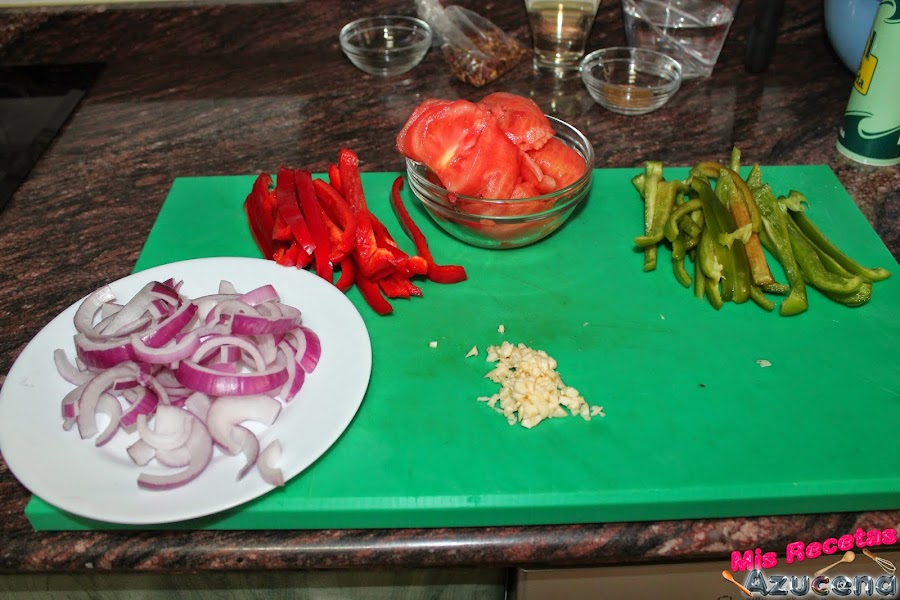 Ahora lavaremos los pimientos y los picaremos en juliana gruesa de más o menos un centímetro de grosor, la cebolla la pelaremos y la picaremos también en juliana, reservamos todo por separado.