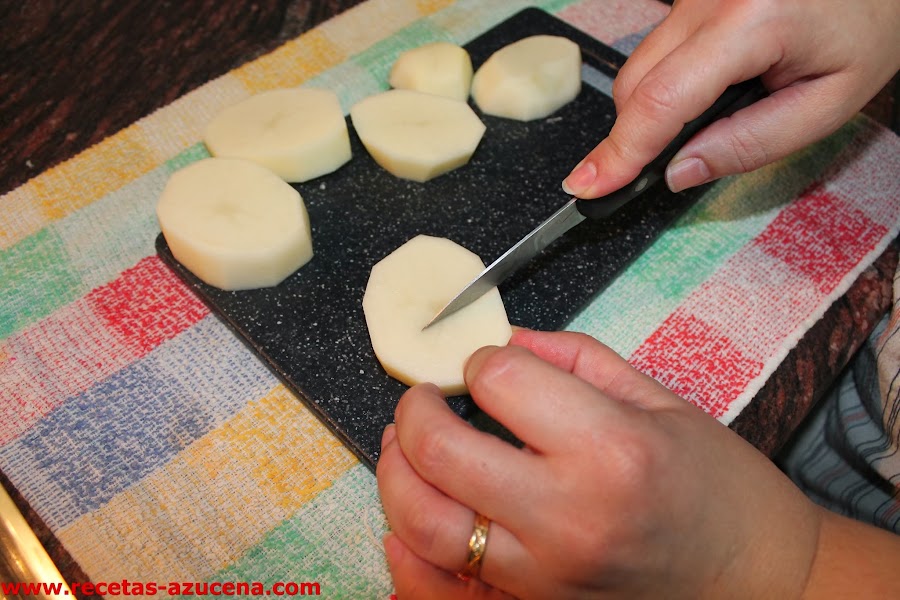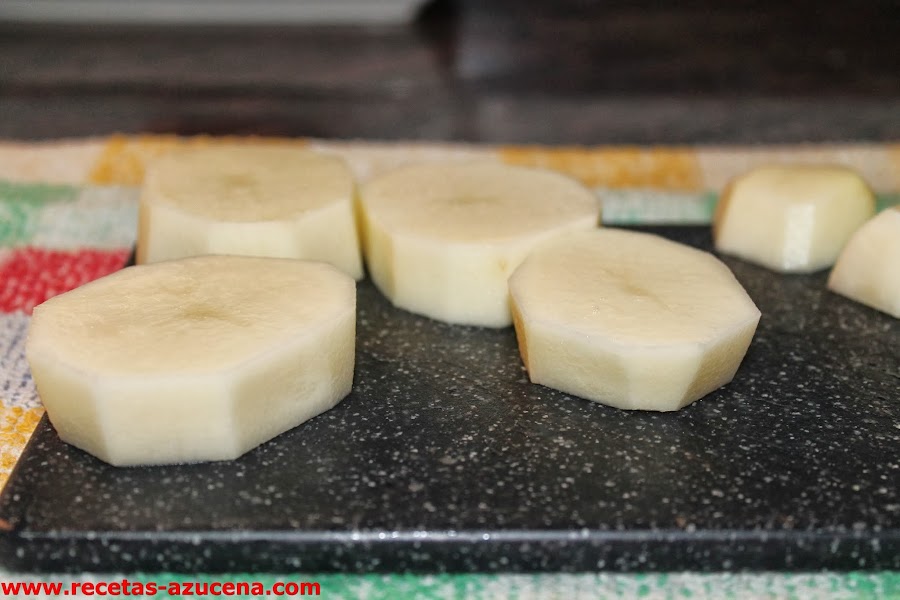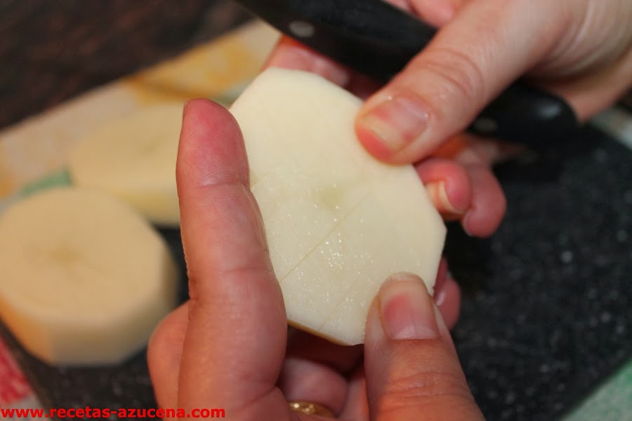 Ahora pelaremos las patatas y las cortaremos en rodajas de un 1,5 centímetros más o menos, cuando las tengamos cortadas, las cogeremos y por un lado le haremos unos cortes a lo lago y después otros a lo ancho sin llegar a cortar la patata, lo que queremos es que se queden como unos cuadraditos.