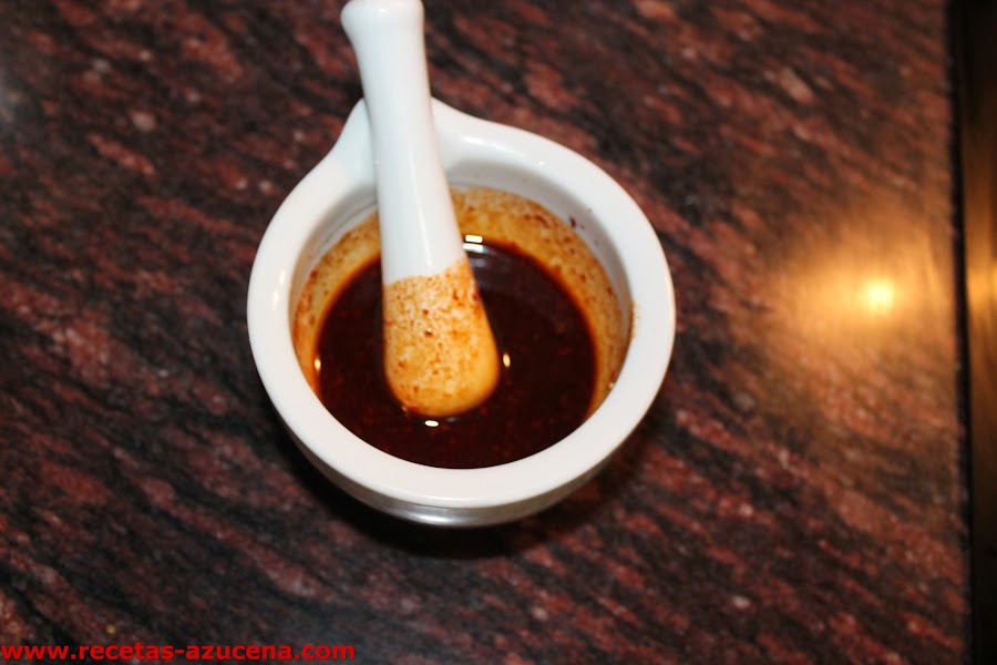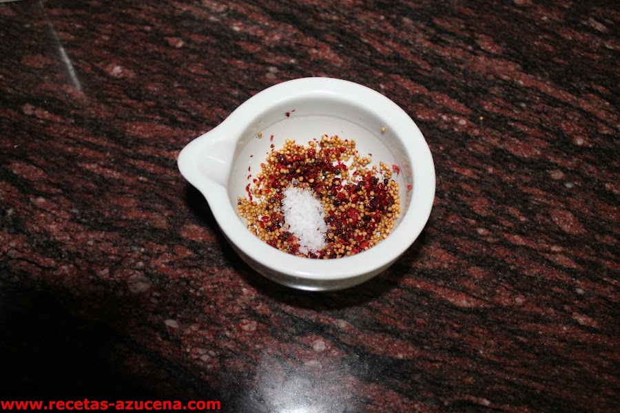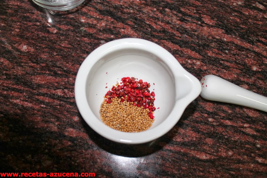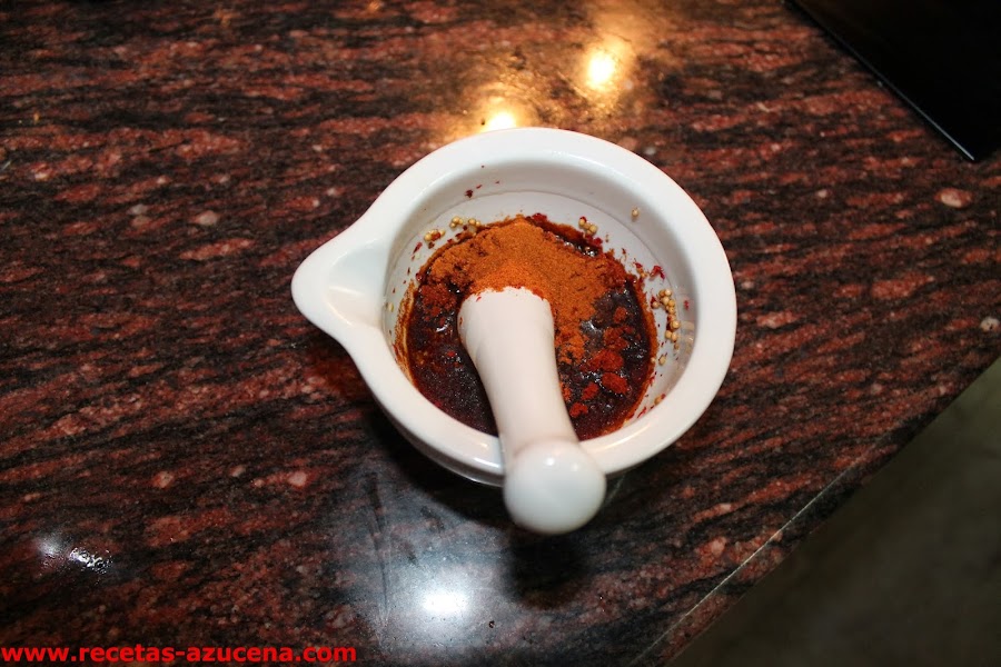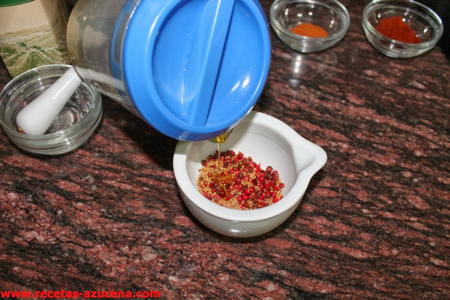 Lo primero que haremos en esta receta será el majado, para ello pondremos en el mortero la pimienta, la mostaza, un poco de aceite y un poco de sal yo puse unos 2 gramos de sal gruesa para ayudar a machacar la pimienta y los granos de mostaza, cuando veas que se han roto algunos granos añadiremos los dos pimentones y un buen chorreón de aceite seguimos machacando un poco y mezclamos bien todo, reservamos.