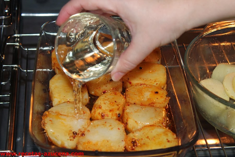 Pasados los 10 abrimos el horno y con ayuda de dos tenedores le daremos la vuelta a todas las patatas y añadiremos el vino, las dejaremos otros 10 minutos más.