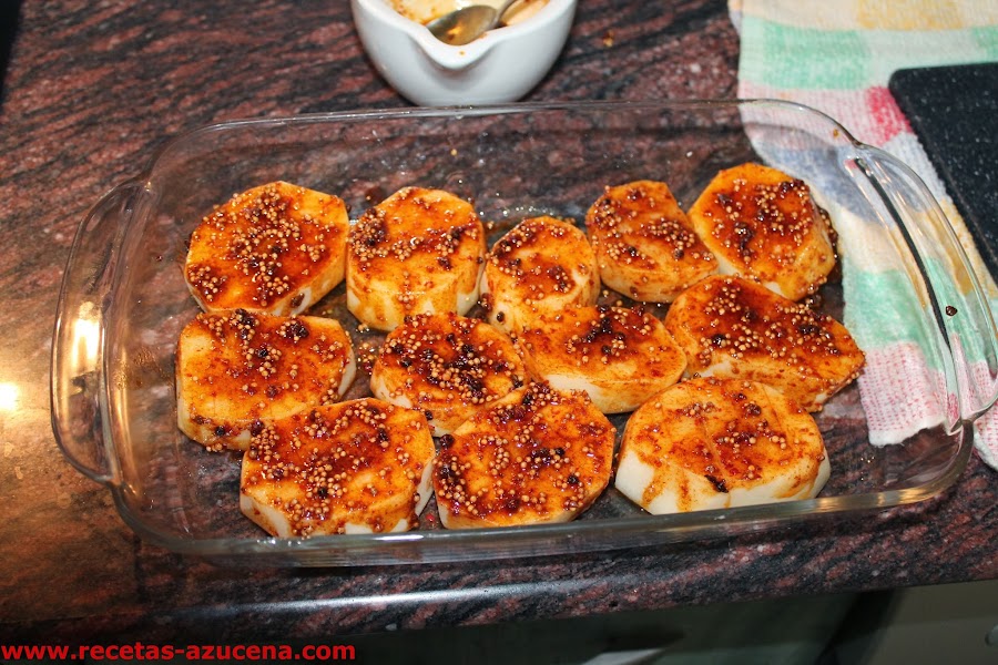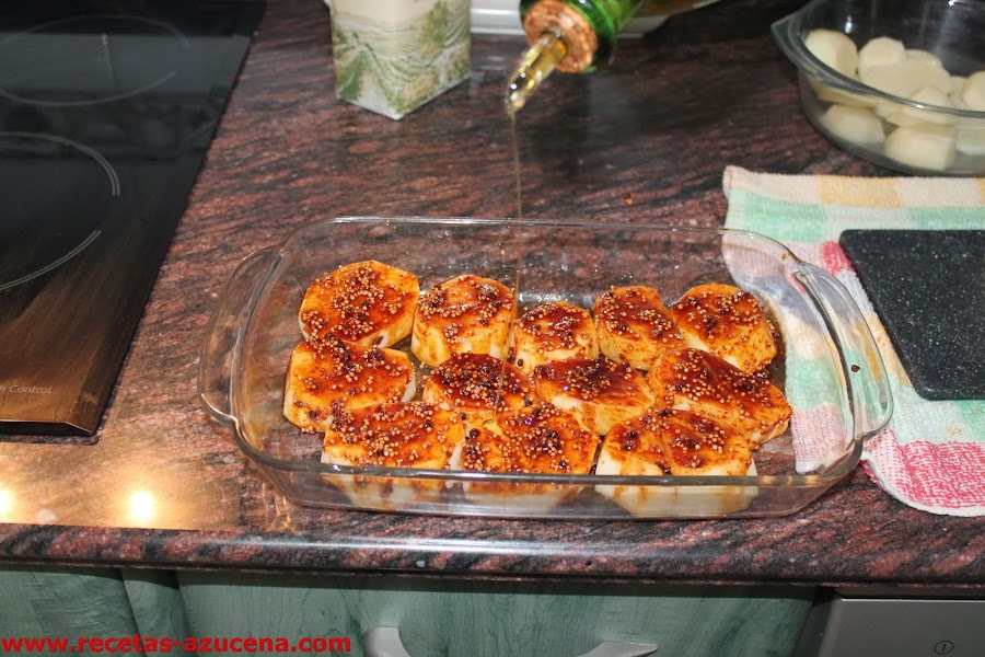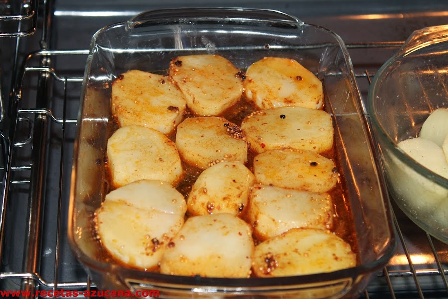 Necesitaremos una bandeja cristal apta para horno, le pondremos aceite por toda la bandeja, cogemos las patatas y el majado que tenemos preparado y le daremos a cada patata por la parte que le hicimos los cortes le pondremos el majado intentando meter un poco por los cortes, las iremos colocando en la bandeja con los cortes hacia arriba, cuando tengamos la bandeja lista, le pondremos todo el majado que sobre por encima y un buen chorreón de aceite, la meteremos en el horno unos 10 minutos.