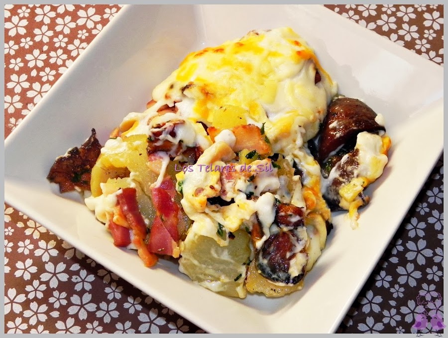 Patatas con níscalos, bacon y bechamel. Riquísimas!