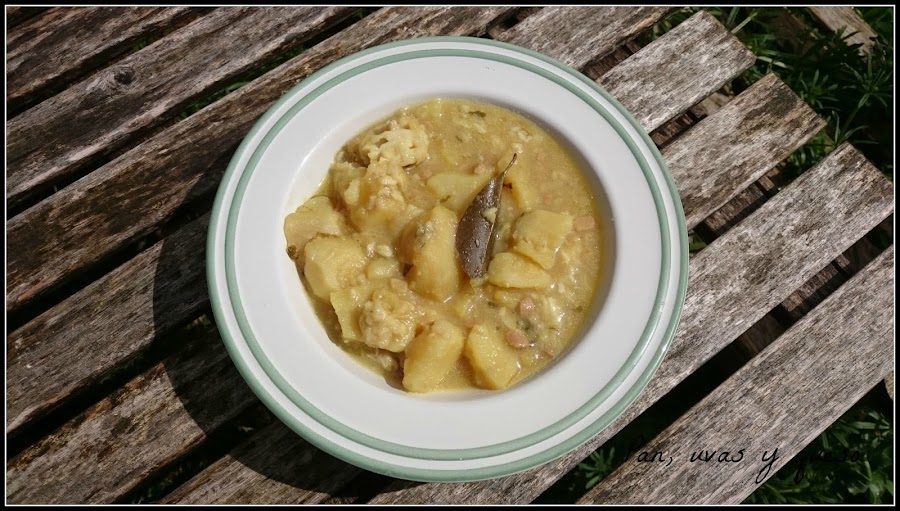 Retiramos el aceite sobrante de la sartén y sofreímos, a fuego bajo, en él media cebolla picada fina y el laurel. Mientras se cocina la cebolla, ponemos en el mortero las almendras, un diente de ajo y una rama de perejil. Lo machamos bien todo y lo desleímos con un chorrito de vino blanco. Lo echamos en la sartén, mezclamos bien con la cebolla y lo pasamos todo a la cazuela donde están las patatas.