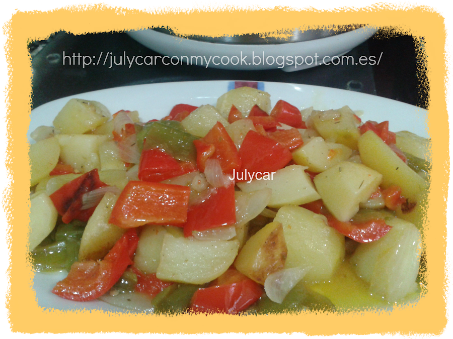 Cortar todas las verduras y las patatas, meter en la cubeta de la cocimix deluxe, añadir sal y el aceite de oliva, remover, tapar con valvula cerrada, programar menú arroz, cuando termine, despresurizar manualmente y servir