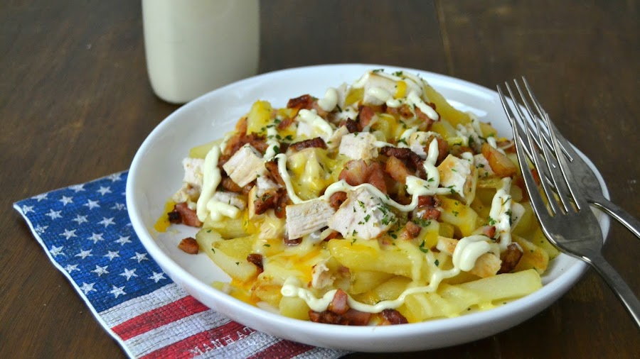 4.- Freímos las patatas hasta que estén doraditas y las ponemos en una bandeja apta para el horno. Añadimos parte de la salsa ranchera, el bacon y el pollo y removemos. Espolvoreamos el queso por encima y gratinamos unos minutos hasta que el queso quede fundido.