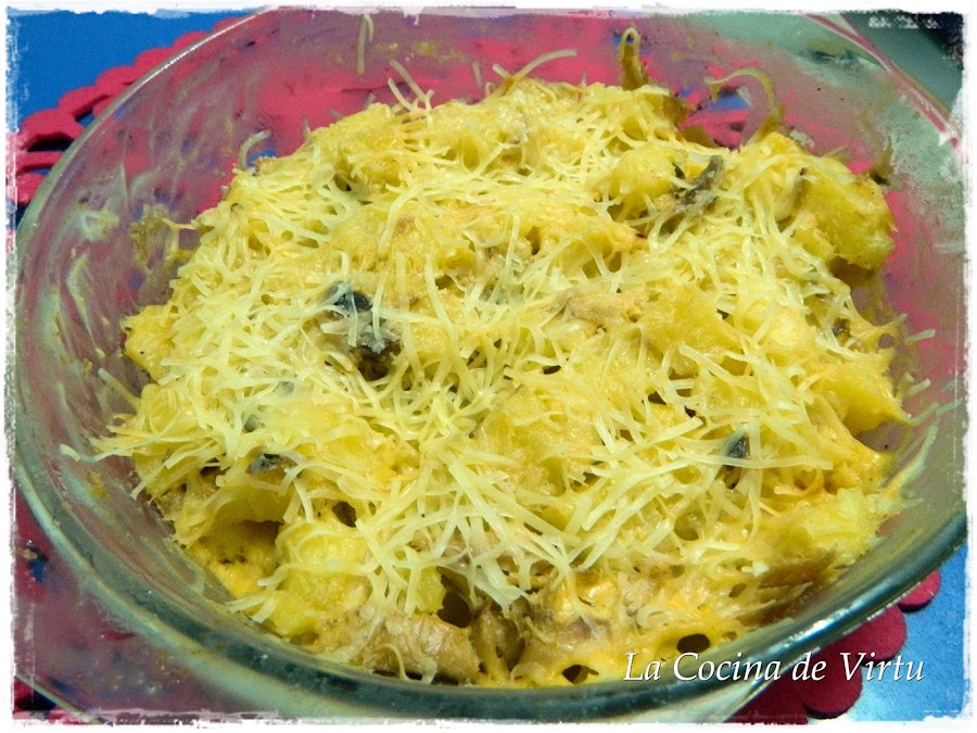 Agrega las patatas, el atún y el queso, (reserva un poco de queso para la presentación). Remueve bien. ( opcional añade un poco de leche si quieres una salsa más suelta) 10 min 800w