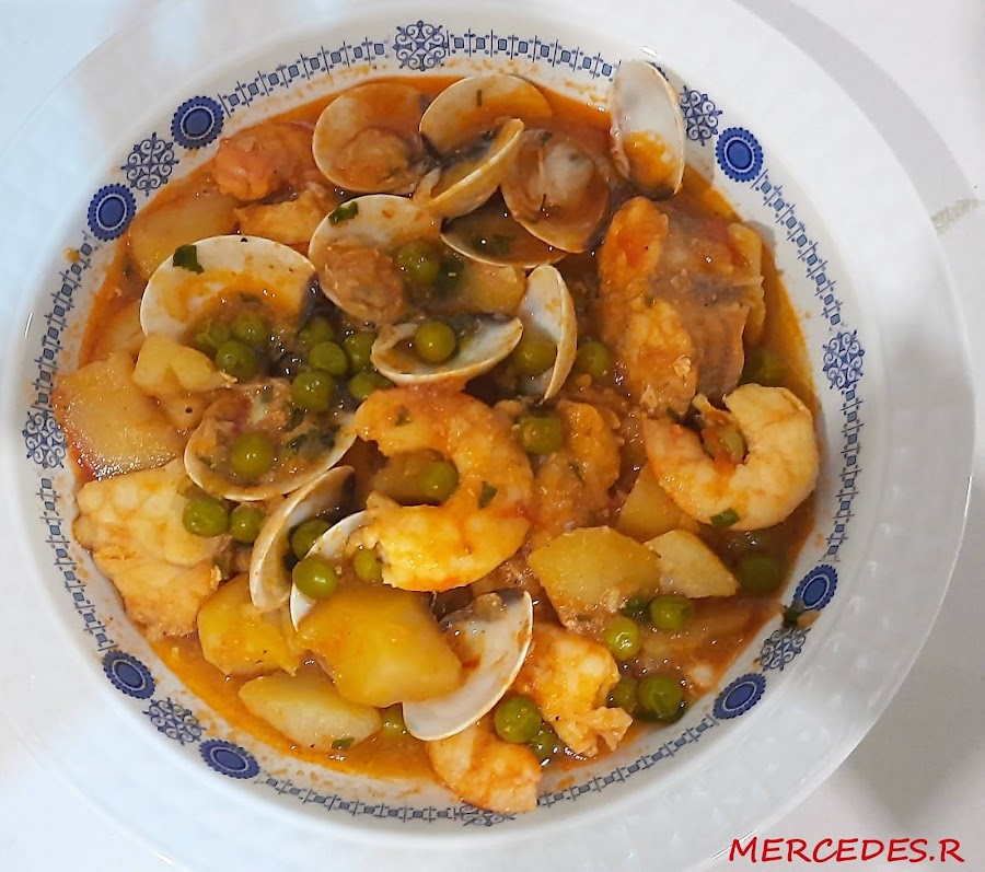 Una vez tiernas las patatas, añadimos la merluza, las almejas los langostinos pelados.