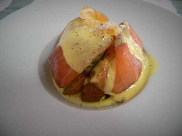 Es la hora de emplatar, en un plato hacemos una montaña con las patatas, colocamos el salmón sobre estas y napamos con la salsa holandesa, salpimentamos y listo, a disfrutar.