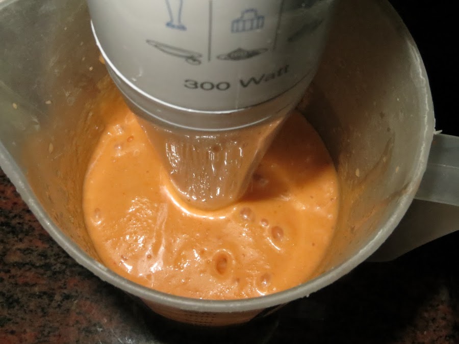 Por otra parte, realizamos el salmorejo, ponemos el pan duro en remojo con agua, pelamos los tomates y el ajo, echamos todos los ingredientes a la batidora y batimos hasta que consigamos la textura deseada, debe quedar un poco espeso.