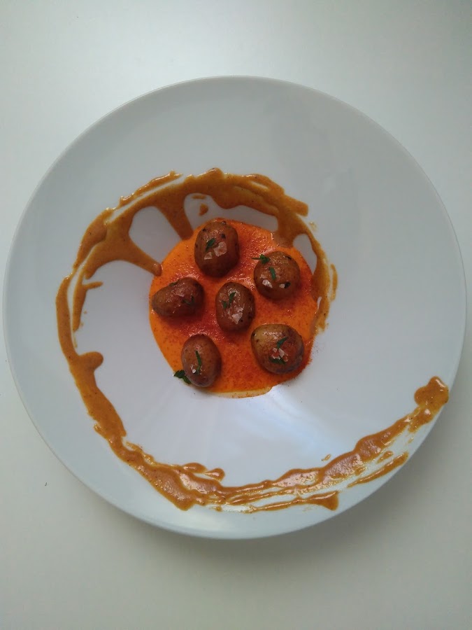 Sobre una base de salsa de tomates asados colocamos las patatas confitadas. Espolvoreamos pimentón y sobre cada patata ponemos sal en escamas y perejil picado.