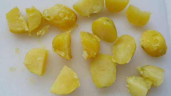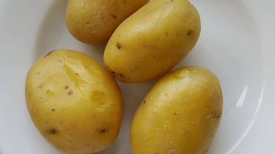 Lo primero que haremos será limpiar bien las patatas, ponerlas en un plato apto para microondas y cocinarlas en dos tandas de 6 minutos a 700 W.