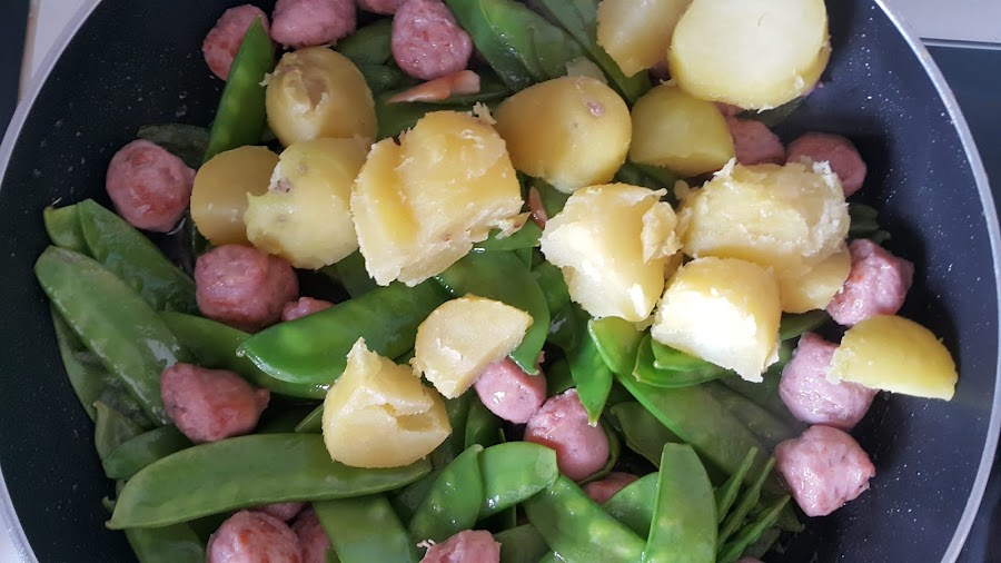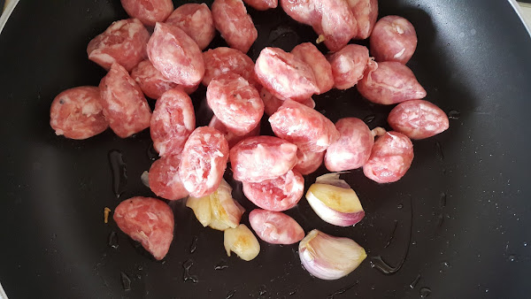 Cuando empiecen a coger color añadiremos la butifarra cortada en porciones de un bocado y cocinamos hasta que empiece a dorarse.