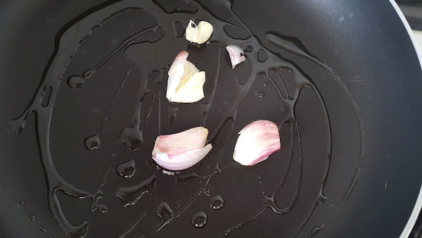 Mientras se cocinan las patatas aplastaremos 2 ó 3 dientes de ajo y los pondremos a fuego bajo en una sartén con un poco de aceite.