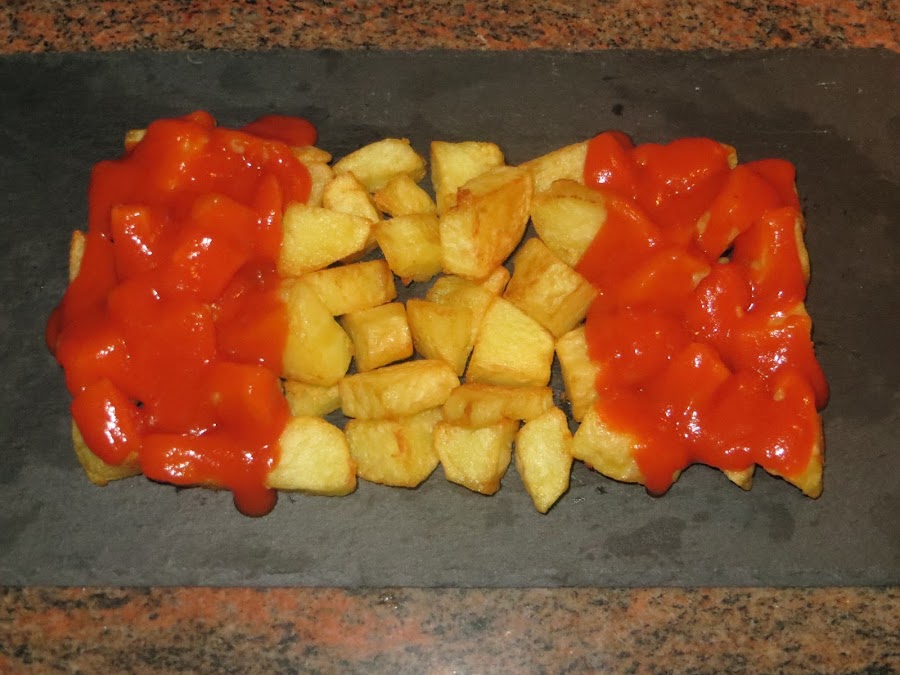 Ahora llega el momento de montar el plato, ponemos en una bandeja las patatas bien escurridas de aceite y ponemos a los lados el tomate frito y enmedio nuestra mayonesa de mostaza formando la bandera de España para darle mucha suerte a nuestro equipo durante la Eurocopa.