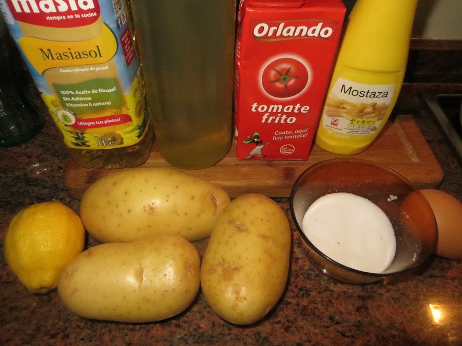 Mientras se van friendo las patatas vamos haciendo la mayonesa de mostaza, echamos en el vaso batidor 100 mililitros de aceite de girasol, un huevo, medio limón y un poco de sal y comenzamos a batir sin mover el brazo de la batidora, una vez que ha cogido cuerpo vamos añadiendo poco a poco los otros 100 mililitros de aceite de girasol y las dos cucharaditas de mostaza hasta que tenga la consistencia deseada, si vemos que no se queda muy amarilla podemos añadirle colorante alimentario.