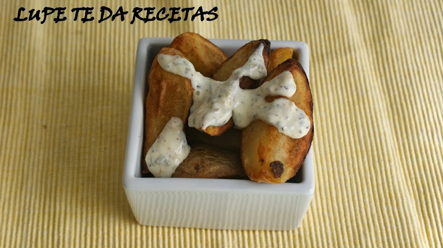 Presentar con la salsa sobre las patatas o si se prefiere con ella a un lado del plato o en salsera aparte.