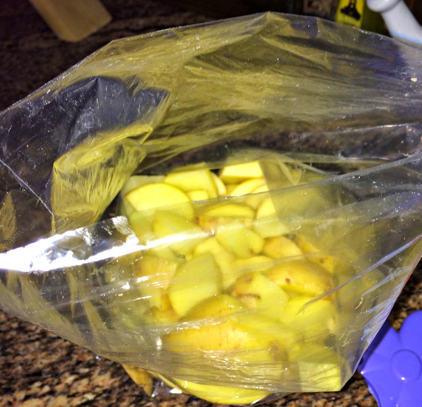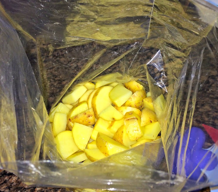 Mientras vamos a lavar muy bien las patatas y las secamos una a una con papel, para asegurarnos que quedan completamente limpias, recordar que comemos la piel. Una vez estén limpias y secas, las vamos a cortar en gajos mas o menos del mismo tamaño, y los meteremos en una bolsa de plástico de las que se usan para congelar.