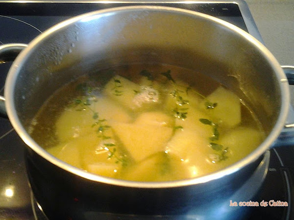 Preparación:Pelar las patatas, cortarlas en trozos y cocerlas en agua hirviendo con sal y una rama de tomillo.