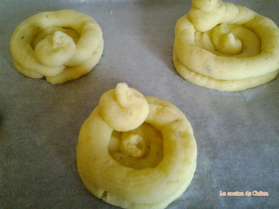 Forrar una bandeja de horno con papel sulfurizado, meter el puré en una manga pastelera con boquilla rizada y formar 4 bases en espiral de unos 8 centímetros de diámetro y subir hasta formar una especie de nido.