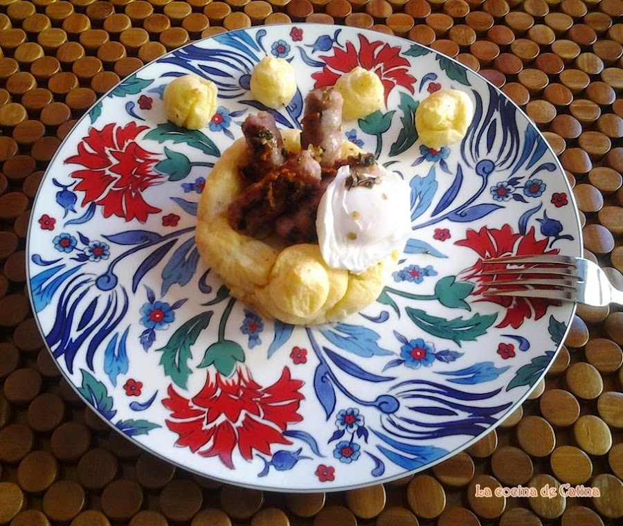 Para presentarlos ponemos un nido en el plato, poniendo por encima 3 trozos de salchichas, un huevo y un chorrito de aceite de freír las salchichas y las hiervas por encima.