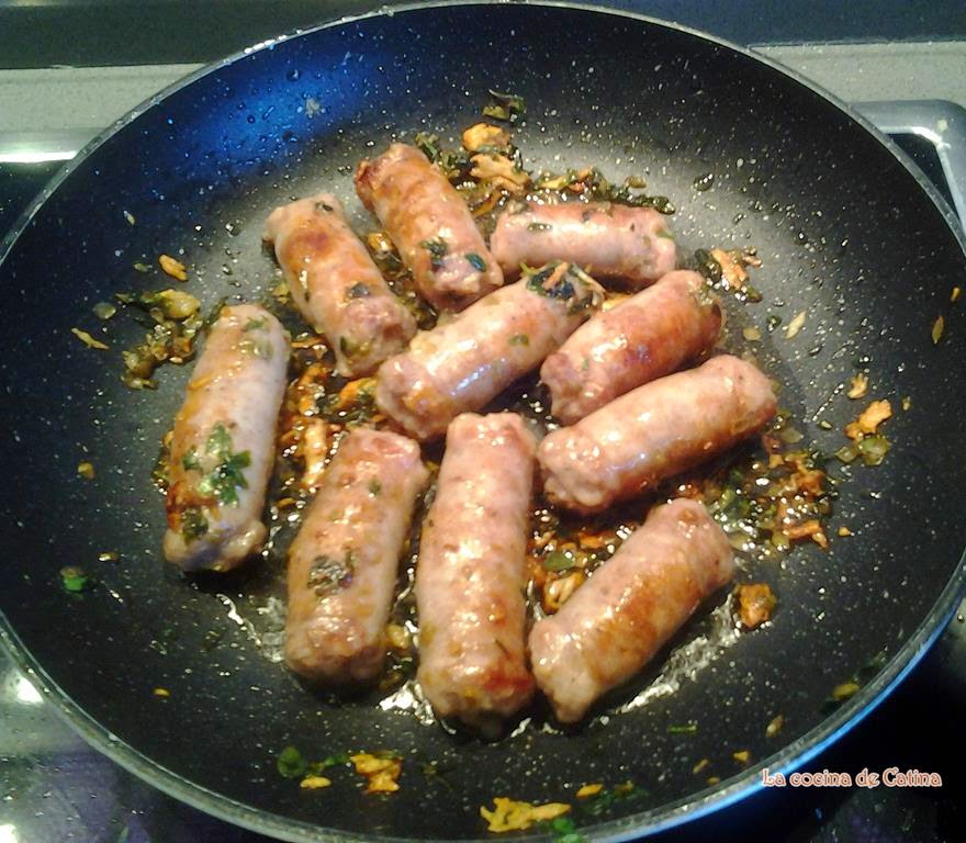 Ponemos a calentar 3 cucharadas de aceite en una sartén y rehogamos el ajo machacado, el perejil y el orégano, echar las salchichas partidas por la mitad y freírlas.