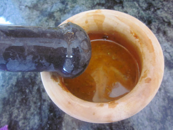 En el mortero, hacemos un majado con los ajos, el comino, el orégano y el pimentón, nos quedará como una pasta, añadimos el vinagre, el agua y tres cucharadas de aceite donde hemos frito las patatas.