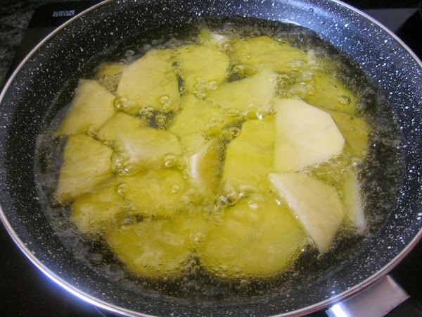 Vamos a ir freír las patatas a fuego medio, y las vamos reservando en una cazuela donde daremos uno hervor con el majado.