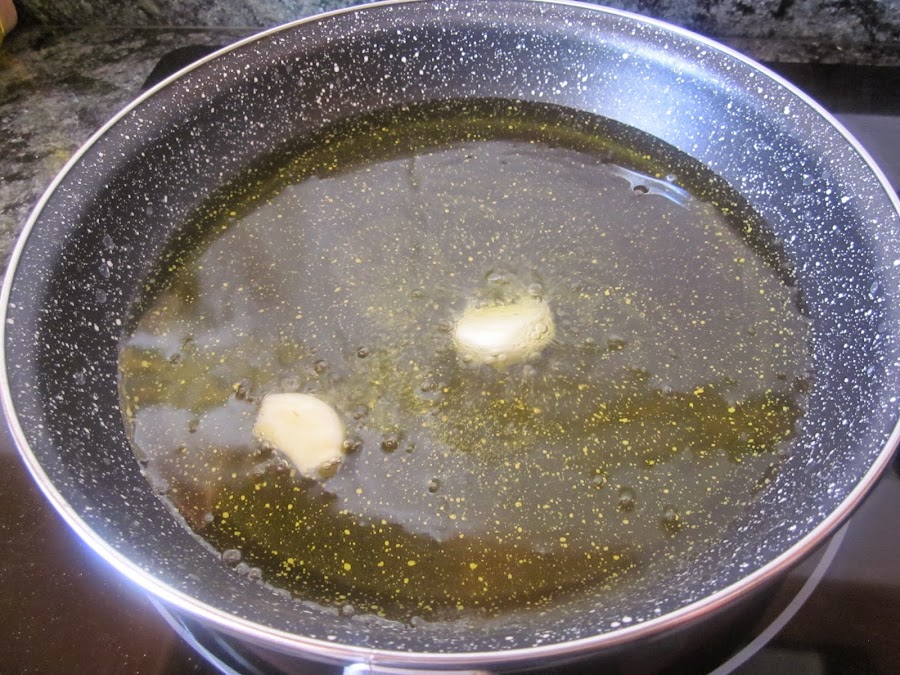 Llenamos una sartén de aceite y freímos los dientes de ajo pelados, reservamos en el mortero.