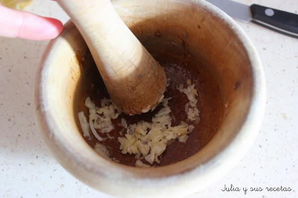 Machacamos los ajos en un mortero. Le añadimos agua y se lo añadimos a las patatas fritas. Si tienen demasiado aceite le quitamos un poco.