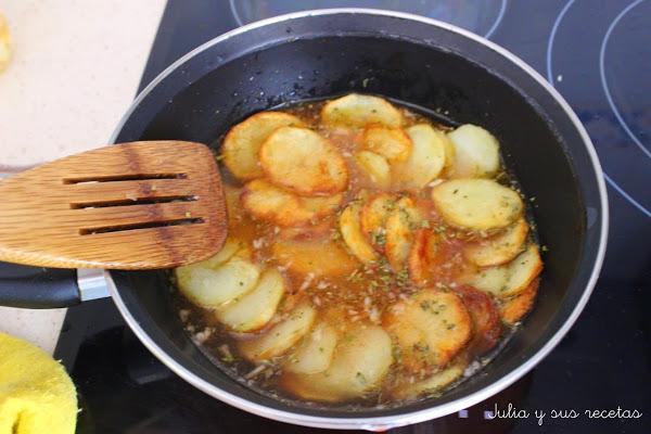 Añadimos el pimentón, el vinagre, el comino y el orégano. Le ponemos agua hasta cubrirlas y las dejamos cocer unos minutos, hasta que estén tiernas.
