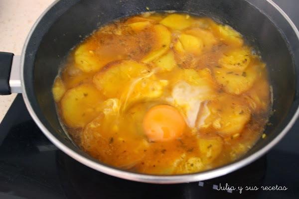 Cuando haya reducido un poco el caldo añadimos los huevos. Se pueden remover con una cuchara y dejar que cuajen o dejarlos enteros y que cuajen sin removerlos.