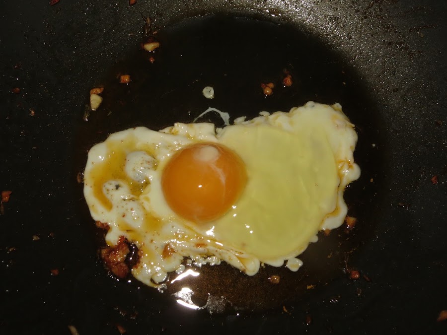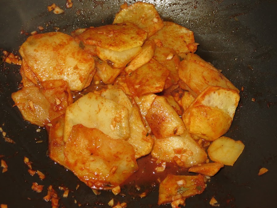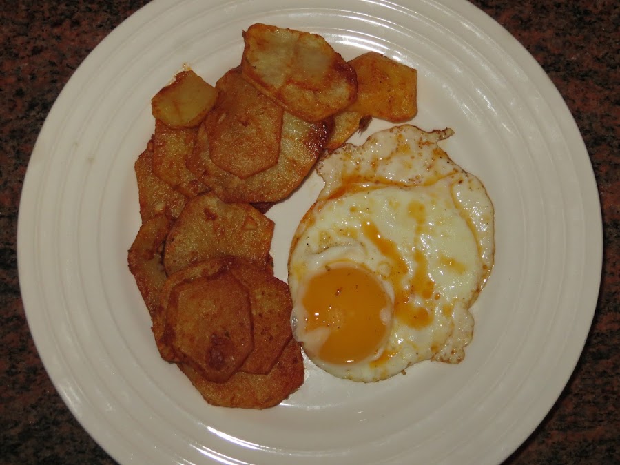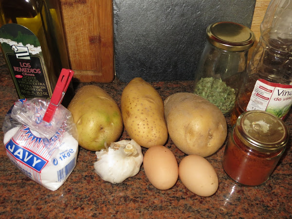 Mientras vamos haciendo nuestro adobo, picamos los ajos y los ponemos en un mortero, junto con el pimentón, el orégano, el vinagre y el agua. En una sartén junto con dos cucharadas soperas de aceite echamos esta mezcla en la sartén y le damos varias vueltas a las patatas para que cojan todo el jugo. Las sacamos y en ese mismo aceite hacemos a la plancha los huevos, los ponemos junto a las patatas cogemos una barra de pan y a comer.