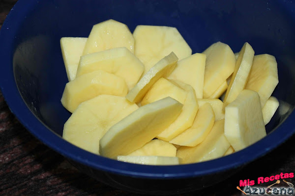 Lo primero que haremos será pelar las patatas y cortarlas en rodajas de 1 centímetro de grosor, como si fuesen para patatas a lo pobre.