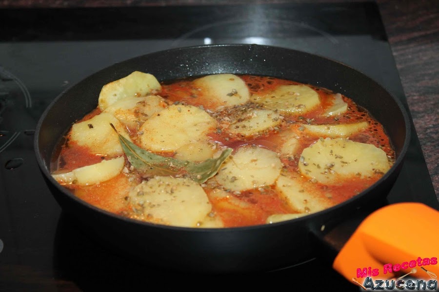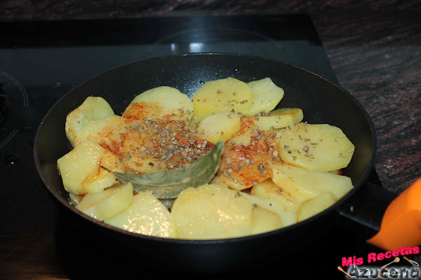 Ya tenemos el majado preparado ahora ponemos una sartén al fuego a fuego medio, utilizaremos una sartén que no sea muy grande, yo utilice una de 24 centímetros, añadiremos las patatas que tenemos junto con el aceite que hallan soltado, ponemos la hoja de laurel, una pizca de orégano y el majado.