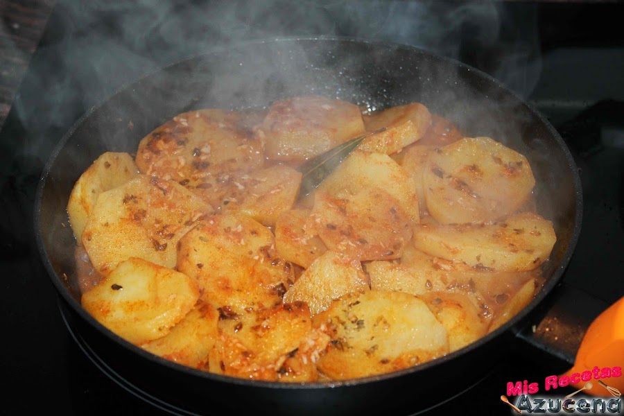 Si el majado no cubre las patatas añadiremos agua hasta que cubran, subimos el fuego a fuego fuerte y dejamos hasta que se evapore el agua.