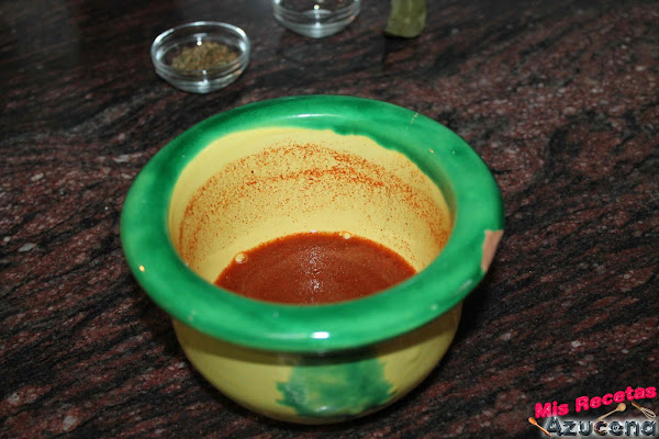 Cuando tengamos los ajos bien machacados añadiremos el pimentón, el comino, el vinagre, la guindilla de esta no pongo cantidad es a gusto de cada uno de como os guste el picante y un poco de agua para que se mezcle todo bien.