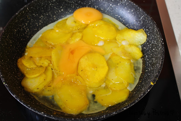 Cuando las patatas estén a nuestro gusto le retiramos parte del aceite y dejamos en la misma sartén. Añadimos el adobillo y si las dejamos un par de minutos para que el vinagre se suavice. ya las podemos consumir tal cual y freir un huevo aparte. yo he querido cuajar el huevo en la misma sartén.
