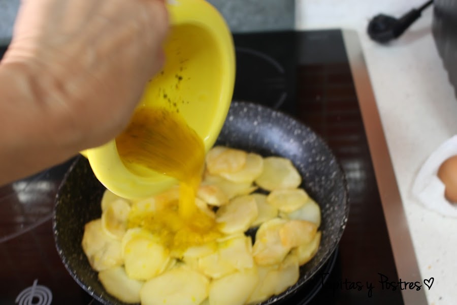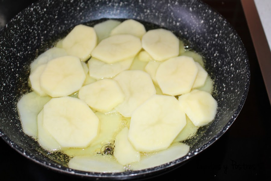 En una sartén con aceite suficiente freimos las patatas cortadas a rodajas no muy gruesas, pero tampoco muy finas y saladas al gusto. Hay que freirlas sin que lleguen a estar crujientes, que estén fritas pero tiernas.