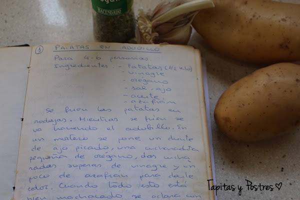 A lo que iba, el otro día saqué el cuaderno para no sé que cosa y mira por donde la primera receta que me aparece son las patatas en adobillo. ¡Me encantan! Me pareció que hacía mucho tiempo que no las hacía y además no las tenía en el blog. Así que aprovecho esta receta para rendir homenaje a mi madre y a todas las madres que se preocupan de que sus recetas pasen de generación en generación. Me temo que en mi caso esto acabará en mi, no veo a mis hijos muy interesados en la cocina...