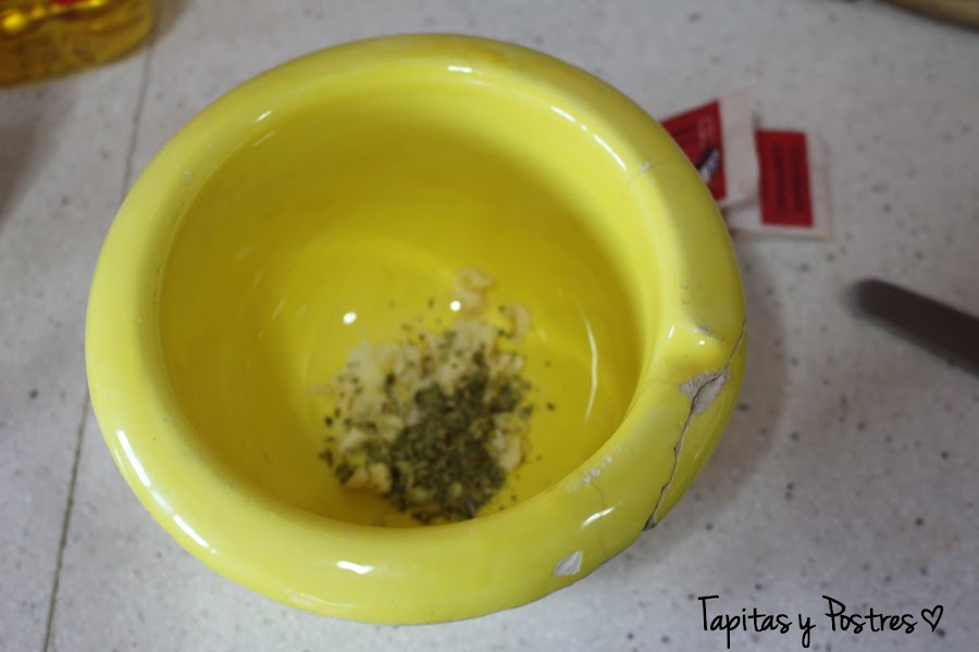 Mientras se hacen las patatas preparamos el adobillo. En un mortero machacamos el diente de ajo con el orégano. Añadimos el vinagre, el azafrán y el agua y reservamos.