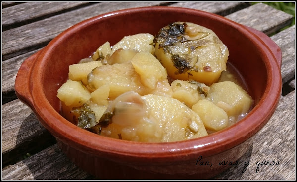 Añadimos las patatas y removemos. Echamos el vino blanco y dejamos que se evapore el alcohol.