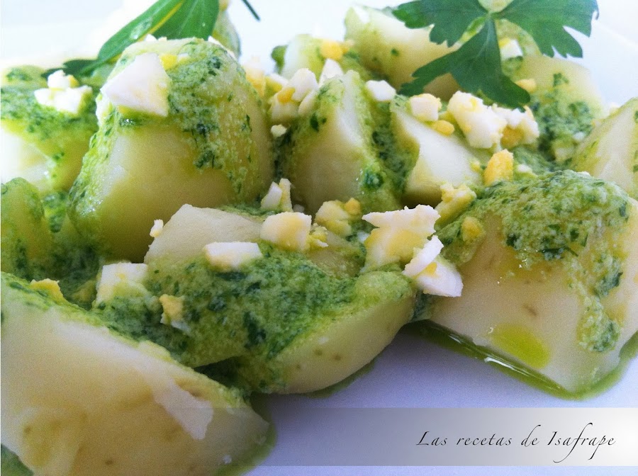Regamos las patatas cocidas con la salsa y espolvoreamos el huevo picado por encima.