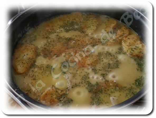 Echamos las patatas en la cazuela donde teníamos la cebolla, cubrimos con el vino y el agua, rectificamos de sal y espolvoreamos con perejil.
